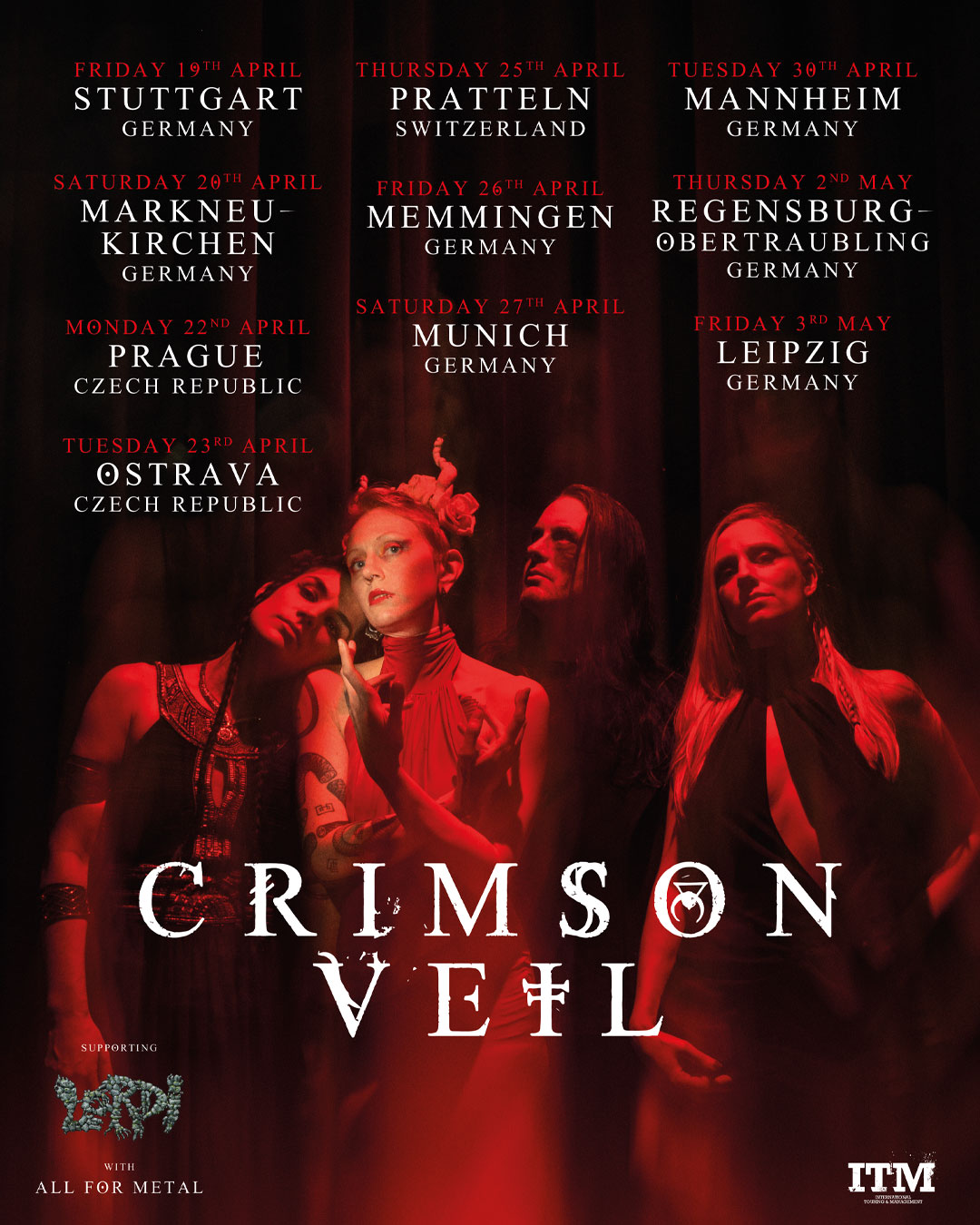 After acclaimed shows in France and the UK, CRIMSON VEIL are now set to continue their journey with LORDI and ALL FOR METAL, bringing their unique brand of alternative metal to fans in Germany, the Czech Republic and Switzerland!